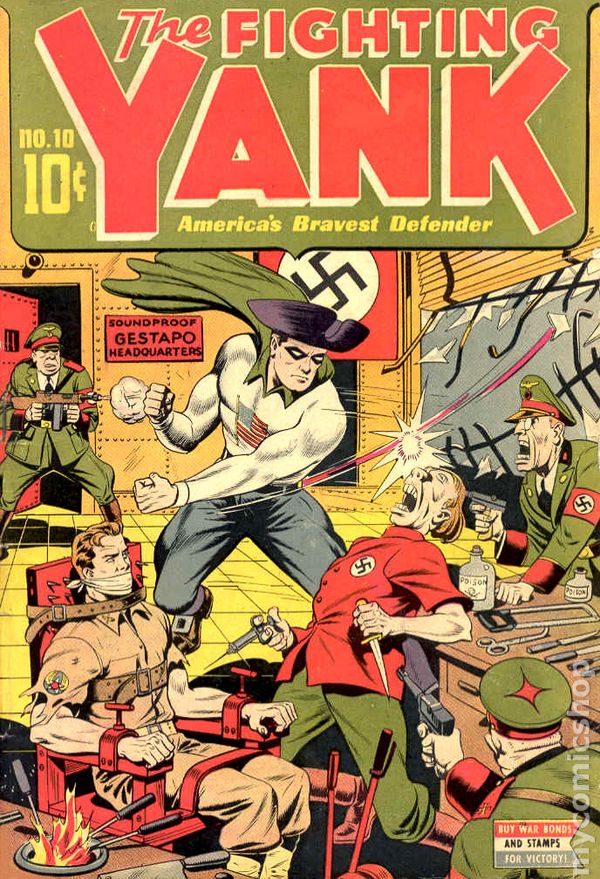 With American abstention in the growing war remained a topic of debate, creators Joe Simon and Jack Kirby made their feelings known with the creation of Captain America (Captain America Comics # 1 March, 1941). The cover famously featured Cap punching Hitler in the face. This shocking image was the first with many copycats to follow and predates the U.S.A.’s entry by over a half year. This was a brave act for both Marvel Comics and the Simon and Kirby team as the American Nazi bund was still strong in New York City. Mayor Fiorello La Guardia supported Simon and Kirby’s effort and dispatched a special detail for their protection so they could continue to produce the comic book.