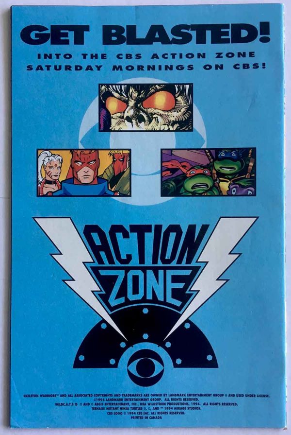 Action Zone # 1 is a promo comic produced by CBS to promote their Saturday Morning Cartoon Line-Up. While Fox Studios had X-Men and Spider-Man animated series on Saturday, CBS had their own cartoons featuring Teenage Mutant Ninja Turtles, Skeleton Warriors, and Jim Lee’s new Wildcats cartoon series.