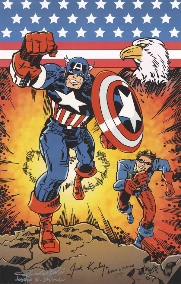 “American Patriots” is based on the Captain America 50th anniversary penciled lithograph by Jack Kirby. The piece was re-envisioned and embellished by artist, Joshua H. Stulman to complete the illustration. The art print was first released as an exclusive to the 2nd Annual Jewish Comic Con held in Brooklyn in 2018.
