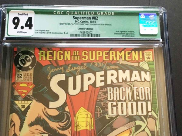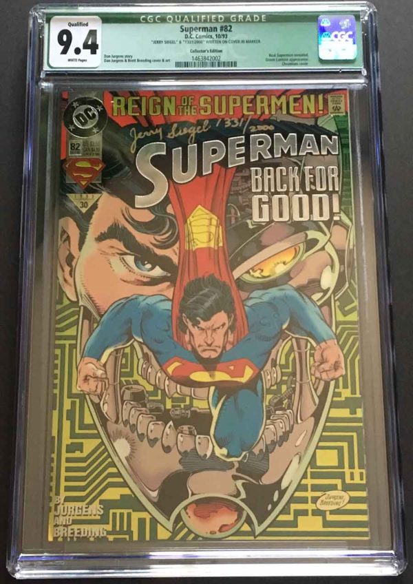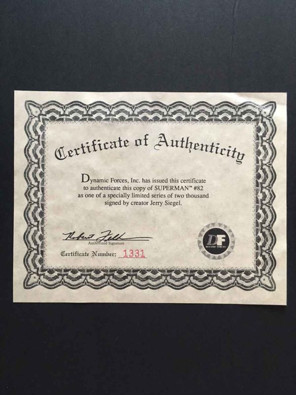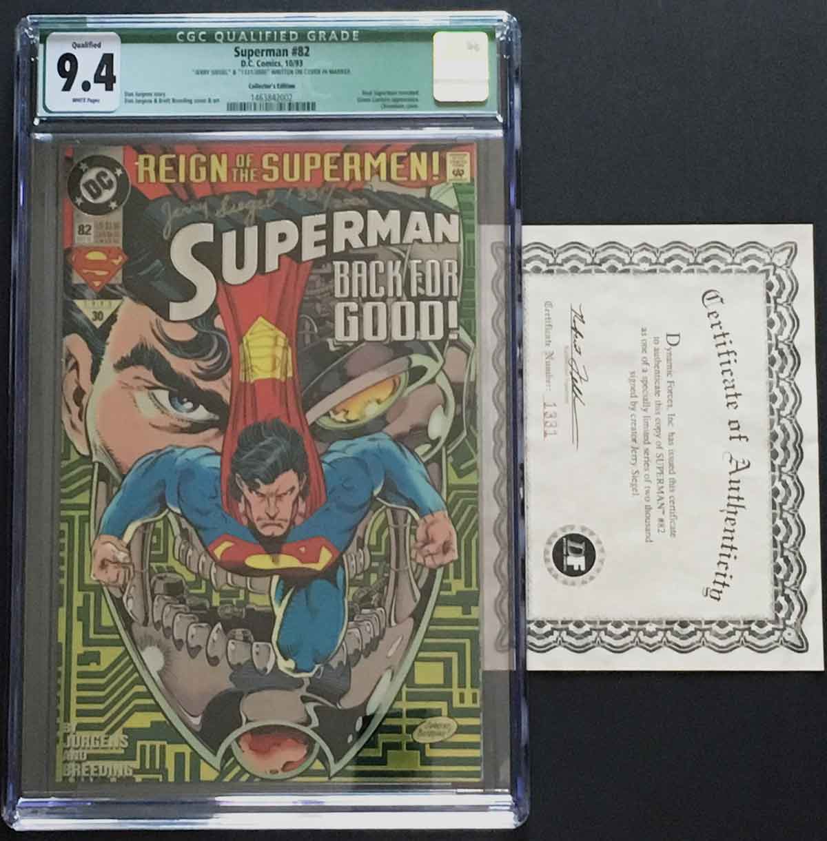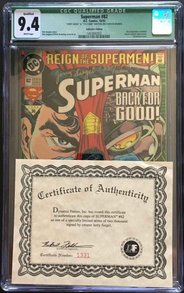 About This Comic:  Superman (vol.2) #82 is hand signed by Superman creator, Jerry Siegel, in Limited Edition of only 2000 copies offered through Dynamic Forces, Inc. This copy is numbered 1331/2000 and comes with the matching numbered Dynamic Forces Certificate Of Authenticity.  The comic has been professionally graded by CGC (Certified Guaranty Company, Inc) and was awarded a 9.4 Near Mint condition grade.