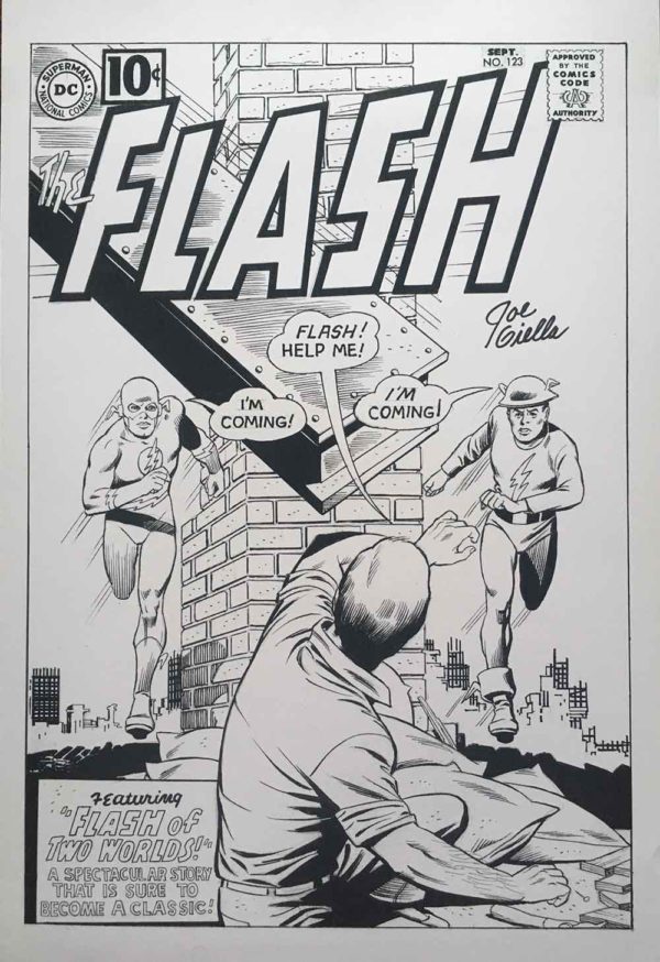 This Flash #123 “Flash Of Two Worlds” Comic Art print was re-created by silver age Flash inker, Joe Giella. He was the inker on many DC Comics during the 1950-1960’s including Flash, Green Lantern and Batman. The “Flash of Two Worlds” story debuted the concept of DC’s Multiple Earths, which has been a staple for DC’s continuity for over 60 years.