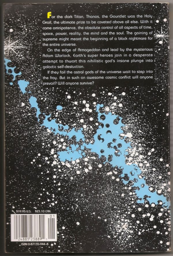 About: The first printing of the Infinity Gauntlet as a Graphic Novel featured a limited edition Silver Foil logo as well as New artwork cover by Jim Starlin. The first printing was produced in limited quantity, and has never been reprinted with the same cover artwork.