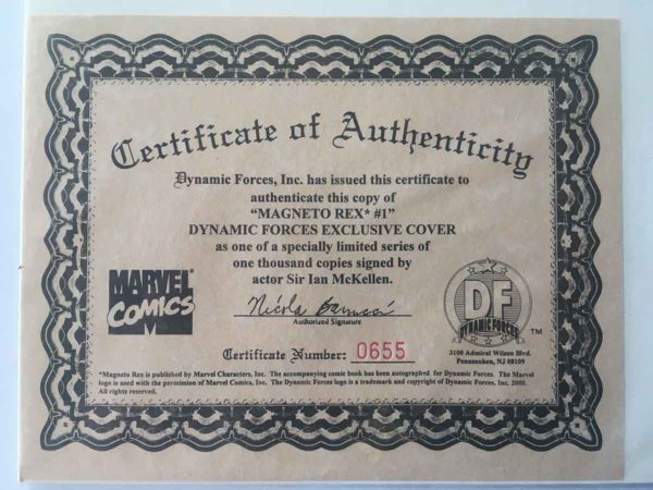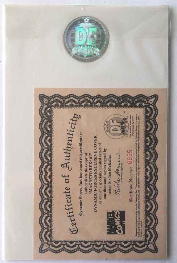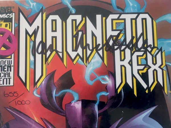 This limited edition Magneto Rex # 1 has been hand-signed by Magneto Actor, Sir Ian McKellen. The book is numbered 655 of 1500 total that were signed as part of a Dynamic Forces Exclusive.