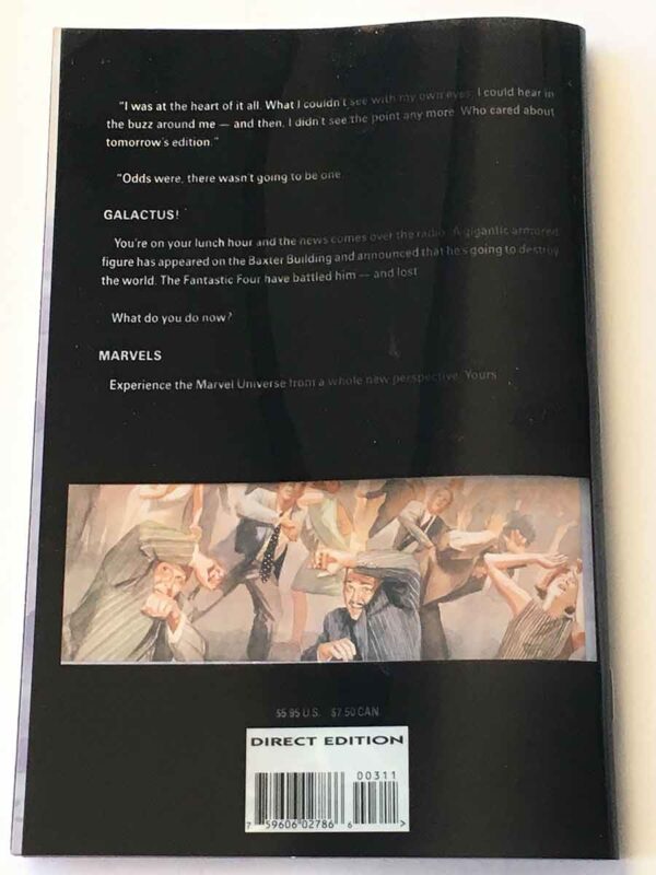 Comic Notes: Marvels is a ground breaking painted mini-series by Alex Ross and Kurt Busiek. The series is known for Ross’s photo-realistic portrayal of super-heroes that would become his defining impact on the comic art industry. The story by Busiek is also revered for its re-telling of the history of Marvel’s Golden and Silver Age from the point of view of an ordinary “man on the street.”