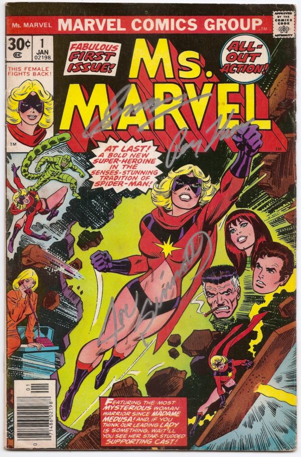 Signature Notes: Ms. Marvel # 1 has been hand signed by creators Roy Thomas (Editor), Gerry Conway (Writer), and Joe Sinnott (Inker). Comes with Certificate Of Authenticity.