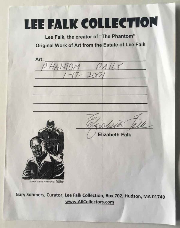 Artist: George Olesen and Keith Williams Size: appx 15″x 6″ Medium: Pen and Ink on Bristol Board About: This is original production art for the Phantom Daily Newspaper Strip by George Olesen and Keith Williams. The Phantom was created by writer Lee Falk (1911-1999). The Phantom has been featured in movie serials from the 1940's, Radio shows, Cartoon series, and a modern Live Action film in 1996. The character was one of the major influences of Batman, whose creators heavily borrowed from the Phantom. The newspaper strip began publication in 1936 and is still published today. This artwork is the original production artwork and is one of a kind. The artwork comes with a Certificate Of Authenticity COA hand signed by Elizabeth Falk from the Lee Falk Estate.