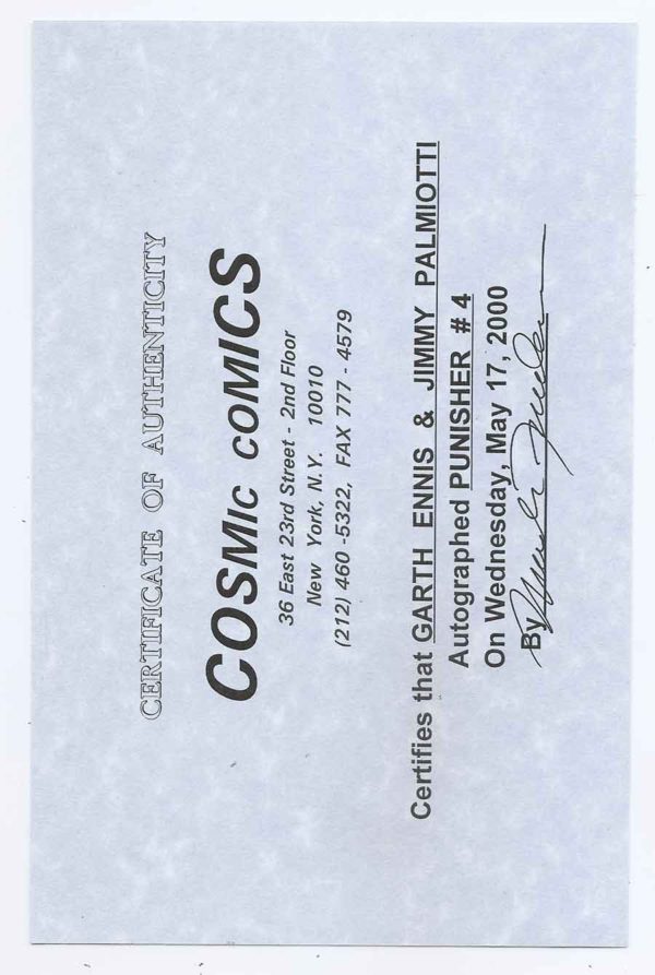 This comic is hand signed by Garth Ennis (Writer) and Jimmy Palmiotti (Inker) at Cosmic Comics Store Signing in 2004.
