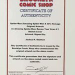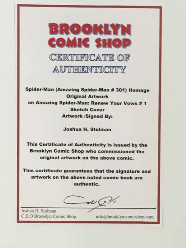This Spider-Man original artwork is by comic artist Joshua H. Stulman. The artwork is Pen and Ink on an Amazing Spider-Man Renew Your Vows # 1 blank cover. The piece was created in homage to Todd McFarlane’s artwork on Amazing Spider-Man # 301. The art perfectly re-interprets the classic cover done in a McFarlane style. This is a one-of-a-kind original artwork, NOT a reproduction.