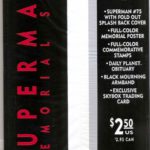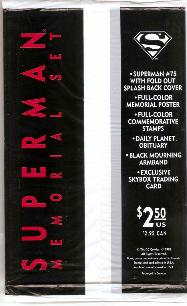 This comic was released in two major editions, the Collector’s edition and Newsstand edition. While both editions featured the same interior artwork, they had two very different covers. The Collector’s edition features a black bag with a bloody Superman emblem. If one were to remove the comic from the black bag, the cover of the Collector’s edition features a tombstone like motif. The Collector’s edition included several items which necessitated the need for the bag. The contents included a poster, mourning armband, stamps, trading card, and Daily Planet editorial.