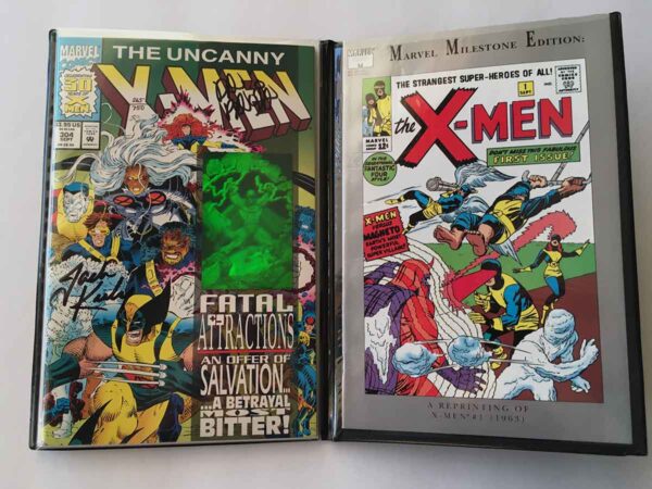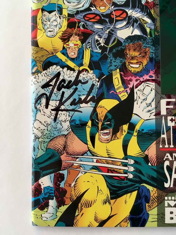 Signature Notes: This RARE comic was signed by Jack Kirby (Co-Creator of the Marvel Universe) as well as Dan Pansion (Uncanny X-Men # 304 Inker). Kirby’s signature is extremely rare and highly sought after by collectors. This book was offered by Dynamic Forces in 1993 in an exclusive deal with Jack Kirby. This limited edition was restricted to only 750 copies. This is 265/750 and comes with its matching numbered original Certificate of Authenticity COA from Dynamic Forces. The book also comes with its original slip hardcover protector and a copy of Marvel Milestones: X-Men # 1 (unsigned).