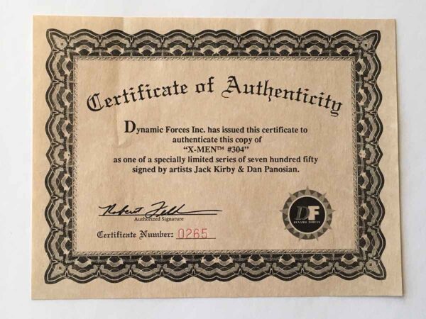 Signature Notes: This RARE comic was signed by Jack Kirby (Co-Creator of the Marvel Universe) as well as Dan Pansion (Uncanny X-Men # 304 Inker). Kirby’s signature is extremely rare and highly sought after by collectors. This book was offered by Dynamic Forces in 1994 in an exclusive deal with Jack Kirby. This limited edition was restricted to only 750 copies. This is 265/750 and comes with its matching numbered original Certificate of Authenticity COA from Dynamic Forces. The book also comes with its original slip hardcover protector and a copy of Marvel Milestones: X-Men # 1 (unsigned).
