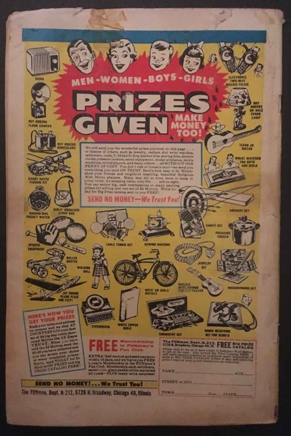 Condition: Golden Age Era comic in Low grade condition with cover wear consistent with grade. Comic is attached at staples. No Cut Outs, No Writing. Comic is complete and has reinforced centerfold.